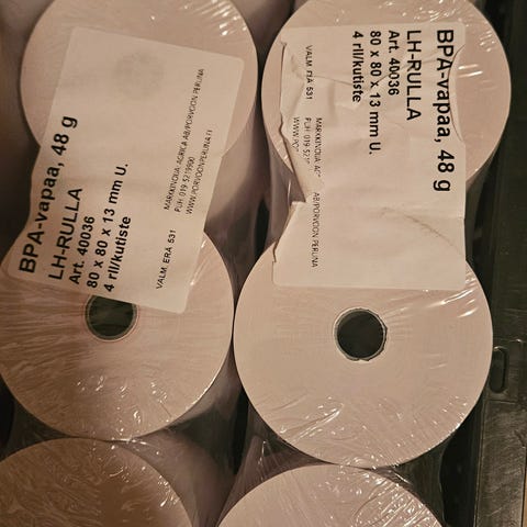 Myydään kassakoneeseen kuitti rullia. Näitä 5kpl paketteja on 7 kpl, kaikki yht hintaan 50€ sis läh kulut