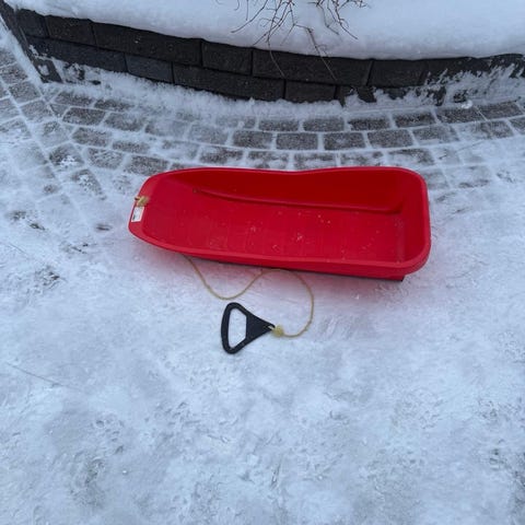 Muovinen pulkka vetonarulla. Pulkka on pinkki ja valmistettu kovasta muovista. Edessä on keltainen vetokahva ja naru vetämistä varten. Sopii yhden lapsen pulkkailuun ja lumessa vetämiseen.