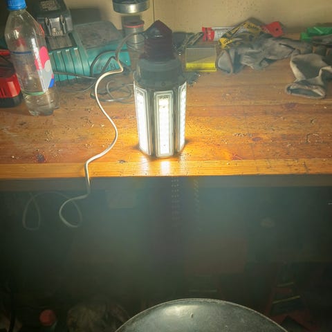 LED-lamppu, jossa E40 kanta. Lampussa on valkoinen yläosa ja läpikuultava alaosa, josta LED-elementit näkyvät. 100W. 4000-4300K. 13000 lumenia. 9kpl