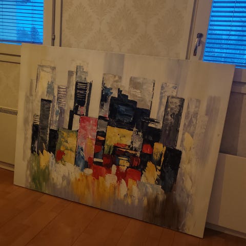 Haloo Helsinki- canvas taulu, jossa neljä jäsentä seisoo ulkona.Kuvan yläosassa näkyy jäsenten nimikirjoituksia. Ostaja maksaa postikulut. Silloin tällöin kulkeutuu Jyväskylään.