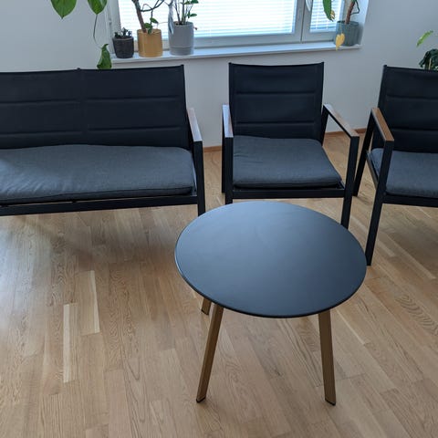 Pöytä on siistikuntoinen ja tukeva. Kompakti koko tekee siitä helpon sijoittaa myös pienempään tilaan.