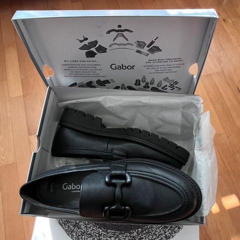 Gabor loaferit, koko 41. Väri musta. Päällinen sileää nahkaa, koristeellinen metallisolki päällä. Vuori vaalea, matala kanta ja kumipohja, jossa kuviointi paremman pidon vuoksi. Sopivat arki- ja toimistokäyttöön.