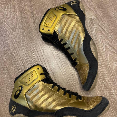 Asics painikengät kamppailulajeihin, koko 42. Kengissä on harmaa, sininen ja punainen väritys sekä korkeampi varsi, joka tukee nilkkaa. Päällinen on hengittävää tekstiilimateriaalia ja synteettisiä vahvikkeita. Pohjassa on kuvioitu kumipohja, joka on suunniteltu tarjoamaan pitoa tatamilla tai muulla sisäliikuntapinnalla. Soveltuvat erityisesti painiin ja muihin kamppailulajeihin sisäkäytössä.
