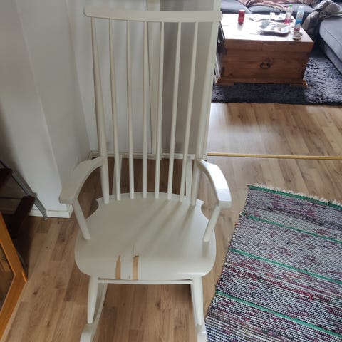 Myydään valkoinen kiikkutuoli. Yleisilmeeltään siisti, paikoittain maalikulumaa. Kuvan taljan saa halutessaan mukana.