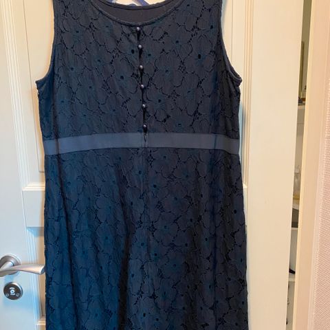 Sininen mekko, jossa pitkät hihat ja edessä pitsi- ja nyörikoristelu. Joustavaa materiaalia.