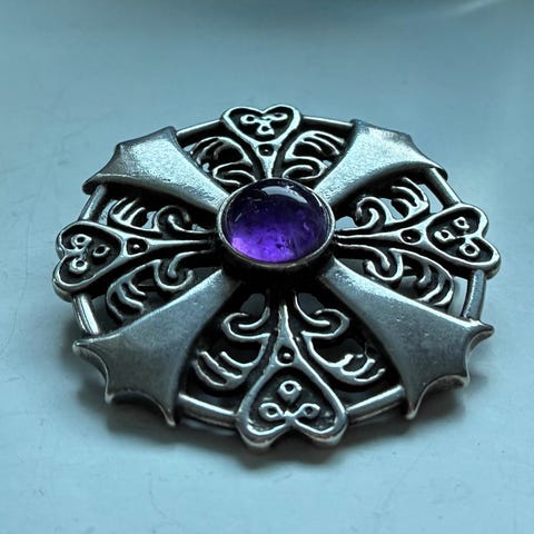 Hopeinen riipus jossa sinertävä kivi synteettistä kvartsia. Uudistuotantoa vuodelta 2014 jolloin tehty pieni erä kyseisiä riipuksia.