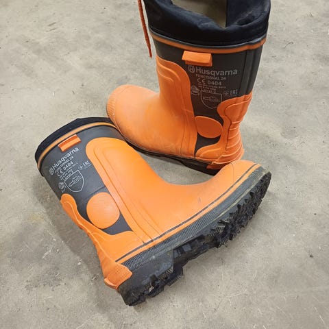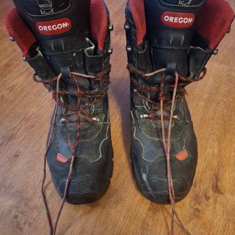 Oregon+ metsurin turvakengät. Yhtenä talvena metsässä/tiellä kävelty, ei ole käytetty metsurinhommissa. Koko 39, nauhat joutuu ostamaan. Eläintalous joten koirankarvoja lämmikkeenä 😅.