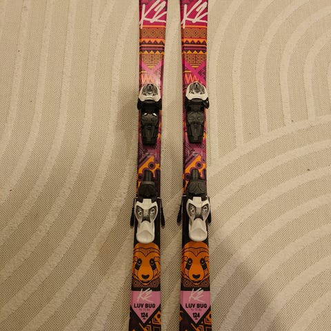 K2 Luv Bug laskettelusukset, pituus 136 cm. Sivuleveydet 96–70–86 mm. Monivärinen graafinen kuosi, pääväreinä violetti ja vaaleanpunainen. Sopivat rinnelaskuun esimerkiksi nuorelle tai pienikokoiselle laskijalle. Siteet mukana kuvien mukaisesti.