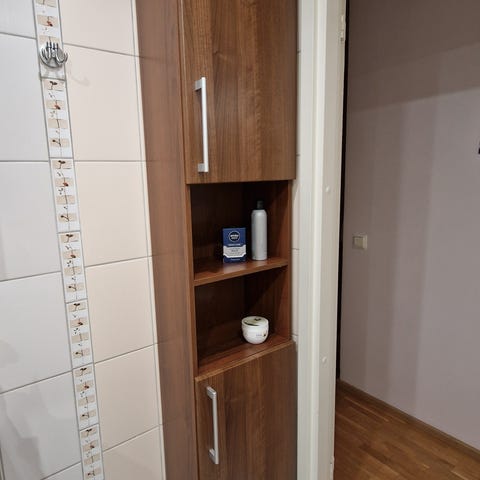 Kulmassa kulumaa ja toisella seinustalla koukut metallikoreja varten. Muuten hyvässä kunnossa.