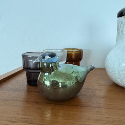 Oiva Toikan suunnittelema Nuutajärven lasilintu. Vihreä-kultasävyinen, virheetön kunto. Pohjassa signeeraus. Pituus n 23 cm.
