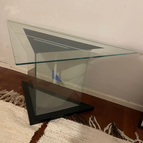 Lasinen sohvapöytä kromijalustalla 83x83. Hyvä, siisti kunto, pientä naarmua ja käyntönjälkeä on.