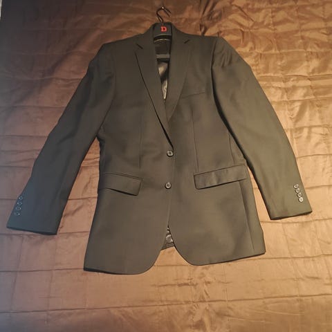 Dressmann miesten puku, väri musta, koko 48. Kokonaisuuteen kuuluu pikkutakki ja suorat housut. Takissa on vuorikangas sekä useita sisä- ja ulkotaskuja. Housuissa on perinteinen suora malli.