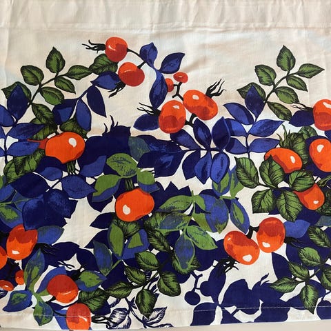 Punaisten kukkien ja lehtien lisäksi tämän kappaverhon koristeena on paljon hopean hohdetta; sekä kukkia että lehtiä rajaamassa kuten myös varsissa ja marjoissa.