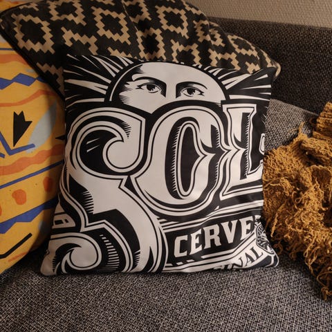 Sisustustyyny samettipäällisellä, ollut sohvalla koristeena.
