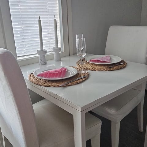 tumman puisen värinen ruokailusetti, kulumaa löytyy mutta toimiva, pöydässä jatkopala mikä näkyy kuvassakin laitettuna.