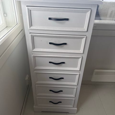 Painava lipasto kolmella laatikolla. Harmaa kansi jossa muutama naarmu.
