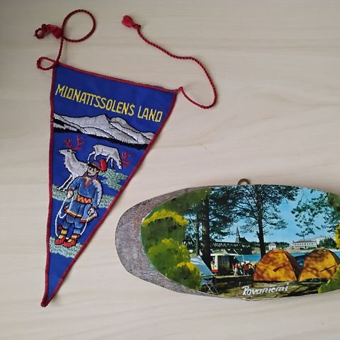 Matkamuisto viirinauha, jossa kolme kolmiomaista kangasviiriä: Inari, Kautokeino ja Sverige. Viireissä on moniväriset painetut matkailuaiheiset kuvitukset maisemista ja saamelaiskulttuurista. Viirit on kiinnitetty nauhaan ripustamista varten. Sopii esimerkiksi sisustuselementiksi, kokoelmaan tai matkamuistoksi Lapin ja Pohjois-Skandinavian alueilta. Hinta vain 2 euroa kpl. Voin lähettää. Mmm.