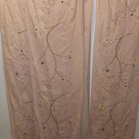 Hennon vaaleanpunaiset kappaverhot. Näitä kolme kappaletta, joista yksi pidempi ja kaksi lyhyempää.