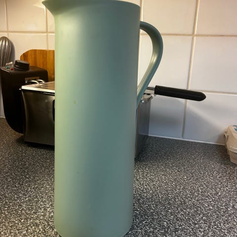 Termoskannu ja sokerikko. Pyöreärunkoinen valkoinen termoskannu, jossa on kaatonokka, kansi ja kahva mustin yksityiskohdin sekä pienet jalat. Mukana erillinen musta sokerikko, jossa on jalat ja kansi kaatonokalla. Sopii teen tai muun kuuman juoman tarjoiluun sekä sokerin tai muiden lisukkeiden säilyttämiseen pöydällä.