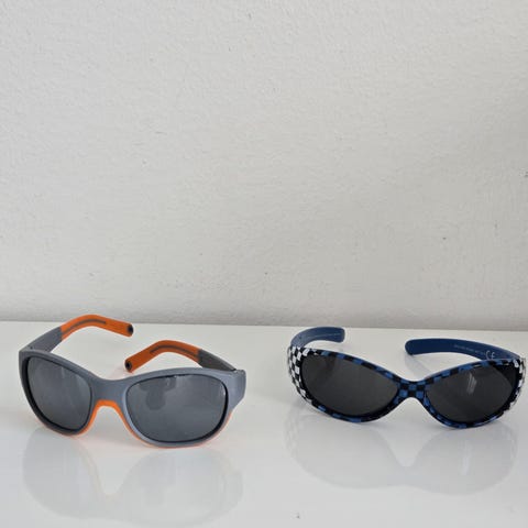 Paljon käytetyt ja naarmuiset ruskea sankaiset taaperon aurinkolasit.