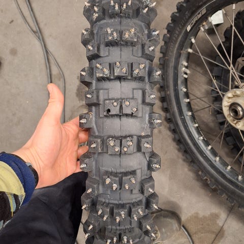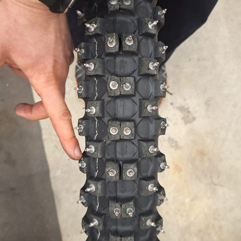 Nastarengas enduroon. Kaikki nastat tallella, tämä rengas on nastoitettu ehkä keskivertoa pienemmällä nastamäärällä