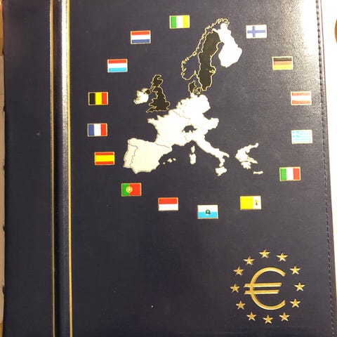The €uro Collection kolikkokansio, jossa 1, 2 ja 5 sentin eurokolikkosarja eri euromaista. Kansiossa on kolikoille omat paikat ja maiden liput sekä perustietoja maista.