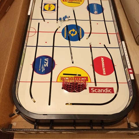 Power Play -pelipöytä, jossa on kolme peliä. pöytäjalkapallo, pingis ja ilmakiekko toisella puolella. Pöytäjalkapallossa tikut vähän kieroja ja yksi kahva puuttuu, mutta on pelattavassa kunnossa. Mukana tulee jalkapallopalloja. Ilmakiekko/pingispöydässä pohjassa murtuma.