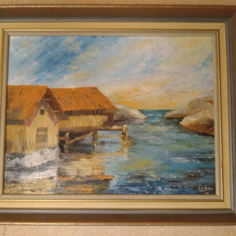 Signeerattu öljymaalaus vuodelta 1949. Maalauksessa on kauniit kultaiset kehykset, joissa on kohokuvioidut kulmakoristeet.