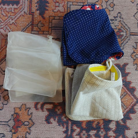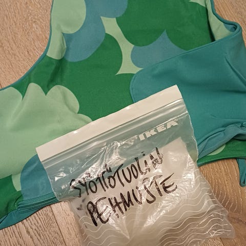 "Puhallettava tukityyny, jossa on pestävä päällinen. Helppo ottaa mukaan sukulaisvierailuille, sillä sen saa ohueksi kuin kirja, kun ilmaa päästetään ulos."