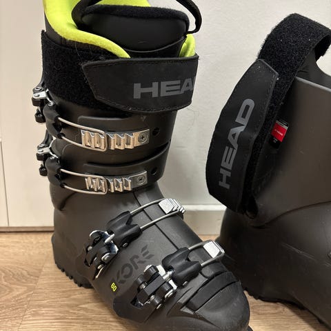 Head Kore 60 Junior laskettelumonot, koko 26.5. Väri musta, sisäosassa vihreä vuori. Monossa neljä säädettävää solkea ja tarrakiristys varressa. Soveltuu junioreille lasketteluun. Ulkopinnassa näkyy käytön jälkiä kuvien mukaisesti.