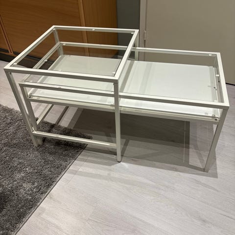 Ikea sohvapöytä. Pyöreä malli, jossa yläosassa kirkas lasikansi ja alhaalla valkoinen pyöreä hyllylevy. Pöytä soveltuu olohuoneeseen sohvapöydäksi tai sivupöydäksi. Lasipinnassa ja valkoisissa osissa on käytön jälkiä ja naarmuja, jotka näkyvät kuvissa.