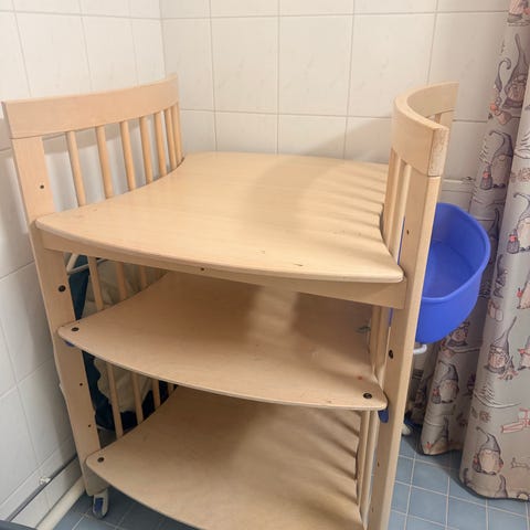 Ikean hoitopöytä, jossa on irrotettava hoitoalusta. Leveys 90 cm, syvyys hoitoalustan kanssa 79 cm ja ilman alustaa 49 cm ja korkeus 101 cm.