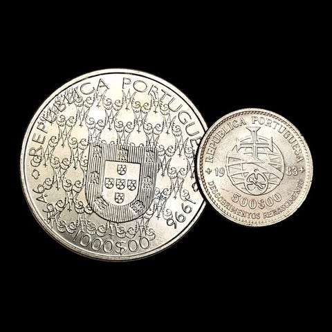 Maailman kolikotPortugal1960/19972 hopeakolikoita (1× 5 Escudos + 1× 1000 Escudos) kiertäviä muistomitaleita (34,30 g)1000 Escudos (Pauliteiros-tanssijat)1997Kolikot › Käytössä olevat muistomitalikolikot: Järjestelmä 1981–2001 – PauliteirosHopea (.500) • 28,2 g • ⌀ 40,1 mmKM# 704, Gomes# R 161, N# 11120viisi escudoa (Prince Henry the Navigator)1960Kolikot › Liikkeessä olevat muistomitalikolikot: Järjestelmä 1927–1968 – Infante D. Henrique kuoleman viidensadan vuoden juhlavuosiHopea (.650) • 7 g • ⌀ 25 mmKM# 587, Gomes# R 36, N# 11159----------------------------------------ToimitusilmoitusHuomaa, että emme tarjoa yhdistettyä toimitusta. Jokainen ostettu tuote lähetetään erikseen, ja jokaiselle tilaukselle sovelletaan erillisiä toimituskuluja.Tämä politiikka mahdollistaa huolellisen käsittelyn ja nopeamman, turvallisemman toimituksen jokaiselle osalle.Arvostamme ymmärrystänne ja olemme käytettävissänne mahdollisissa lisäkysymyksissä.