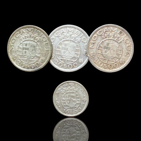 Maailman kolikotMozambiqueHopeiset 2× 20 Escudos -kolikot20 Escudos - 1955/19601952–1960Kolikot › Vakiosirroksessa olevat kiertokäyttöön tarkoitetut kolikot: 4. järjestelmä (1952/74)Hopea (.720) • 10 g • Ø 30 mmKM# 80, N# 6579
