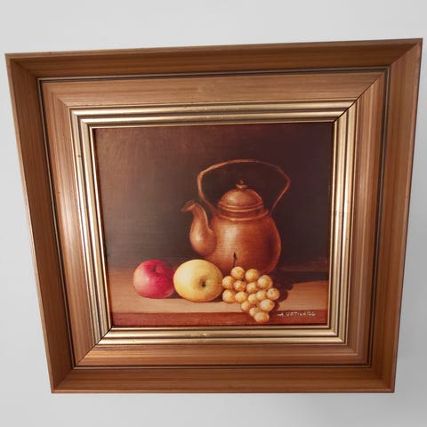 Annikki Poijärven öljymaalaus "Keltainen asetelma" vuodelta 1983. Teoksessa on värikäs asetelma, jossa näkyy hedelmävati, kannu, kuppi ja lasi vaaleankeltaisella ja pastellisävyisellä taustalla.