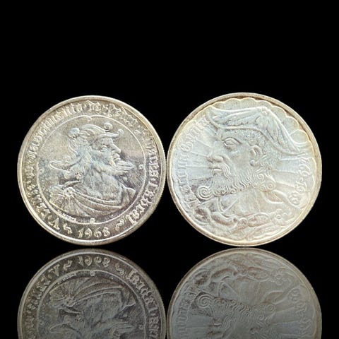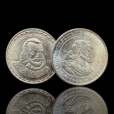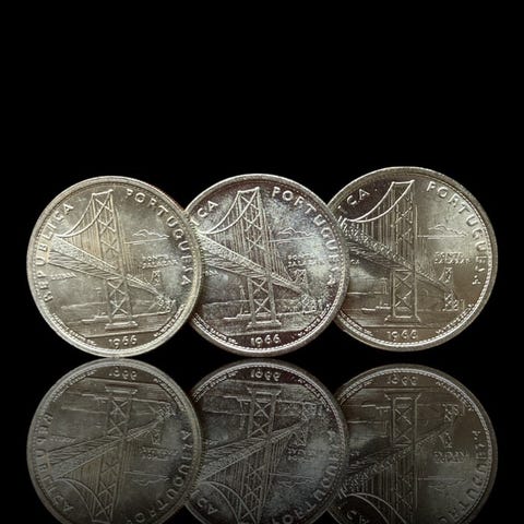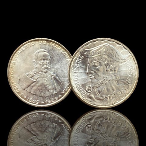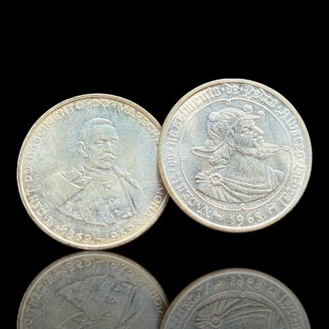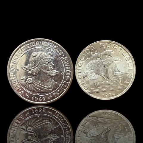 2 x 50 Escudos (Pedro Alvares Cabral)1968Kolikot › Kierrossa olevat juhlakolikot: Järjestelmä 1927–1968 – Pedro Álvares Cabralin syntymän 500-vuotispäiväPrata 650‰ • 18 g • ⌀ 34 mmKM# 593, Gomes# R63, N# 4930