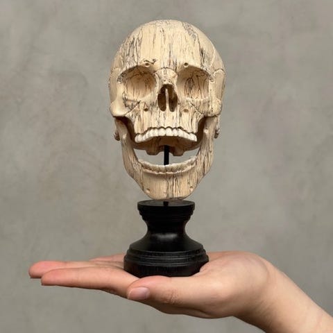 Veistetty pässin pääkallo jalustalla. Kallo on täysin leikattu pois kauniilla ruusukuvioinnilla. Se toimitetaan räätälöidyn mustan rautapedian kanssa, ja siitä voi tarvittaessa irrottaa tämän jalustan.Kaiverrettu on kaunis Big Lotus -motivi.Noin mitat mukaan lukien jalustaLeveys: 46 cmKorkeus: 62 cmPituus: 25 cmHUOM:Yksi tai useampi kuva esittää tyyliteltyä esinettä. Tarkat tiedot myytävästä esineestä löytyvät muista kuvista. Tyylitellyssä kuvassa olevat esineet eivät sisälly myyntiin.Mainittu paino sisältää jalustan ja pakkausmateriaalin.VastuunvapausMyös takana on kiristysnaru, jonka avulla se voidaan kiinnittää seinälle.- Koska kyseessä on luonnollinen kallo, kallossa ja sarvissa saattaa olla joitakin luonnollisia pienempiä halkeamia ja uurteita. Tämä on normaalia. Katso kuvat.- Kallomme puhdistetaan ammattilaisvoimin, mutta joskus hampaissa voi esiintyä pieniä värimuutoksia. Tämä on luonnollista ja normaalia, eikä siihen voida paljoa vaikuttaa. Katso kuvat ohjeiden tueksi.LähetyksetTuote lähetetään seurantanumerolla DHL Parcelin, DPD:n tai postNl:n kautta. Seuranta päivittyy Catawiki-luettelossasi, kun pakettisi on jätetty postiin.Ole hyvä ja tarkista säännöllisesti välttääksesi pakettisi palautumisen meille, jolloin ostaja vastaa toisen lähetyksen toimituskuluista.Seurantaan Espanjaan ja Portugaliin käytä tätä linkkiä ja lisää Catawiki-erästäsi saatu seurantanumero.https://clientesparcel.dhl.es/LiveTracking/HomeME EMME YHDISTÄ TOIMITUKSIA!!!Jos sinulla on kysyttävää paketistasi, ota meihin yhteyttä Catawiki-viestipalvelun kautta. Pyrimme vastaamaan kolmessa työpäivässä.