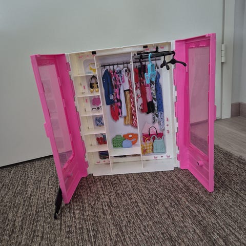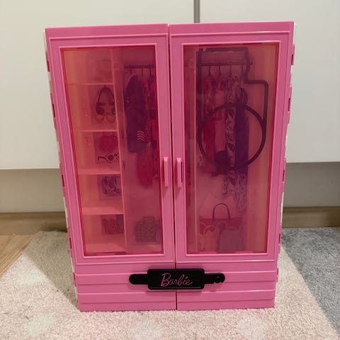 Barbie vaatekaappi lelu. Pinkki kaappi, jossa kaksi ovea ja sisällä hyllyjä sekä tanko vaatteiden ripustamiseen. Sopii Barbie-nukeille ja niiden vaatteiden sekä asusteiden säilytykseen ja järjestelyyn. Kaapin sisäosissa kuvioitu tausta ja tilaa useille vaatteille ja pienille tarvikkeille.