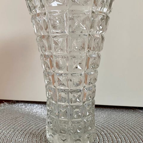 Siisti ja täysin ehyt vintage kristallimaljakko Kaunokki. Suunnittelija Aimo Okkolin, Nuutajärvi. Kyseinen maljakko on suurempi kuin useimmat tarjolla olevat, korkeus 25 cm.