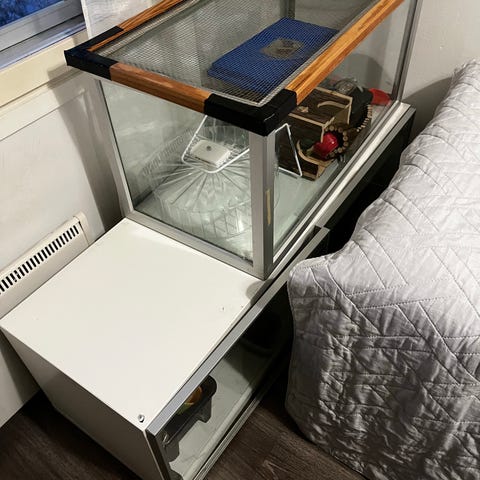 Iso lasinen terraario + muutama mökki, ruokakuppi ja kuljetusboksi. Sopii esim hamsterille tai hiirille. Avautuu molemmilta puolilta edestä. VAIN NOUTO