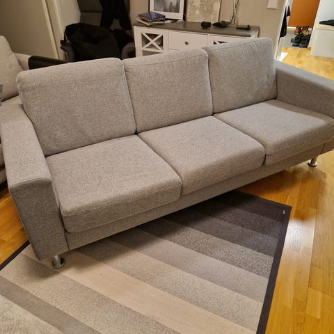 Uutta vastaava kangasverhoiltu 3-istuttava sohva. Pituus 218cm, syvyys 85cm, istuinsyvyys 57cm ja korkeus 85cm.