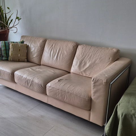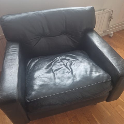2-istuttava ehjä nahkasohva. Hyvä ja toimiva, mutta annetaan pois muuton vuoksi. Leveys 150cm, korkeus 75cm, syvyys 80cm. Merkki ja malli ei tiedossa.