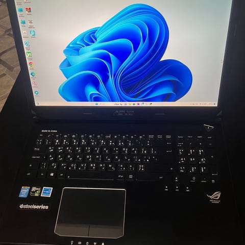 Asus ROG Strix -sarjan kannettava tietokone. Näytön koko noin 17 tuumaa. Rungon väri musta, punaisilla yksityiskohdilla. Näppäimistö täysikokoinen numeronäppäimistöllä.