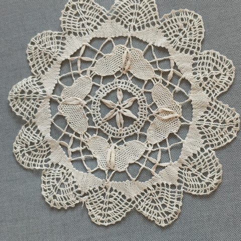 Neliön muotoinen perinteinen pitsiliina vuosikymmenten takaa. Käsinvirkattu, reunassa hapsut. Kunto hyvä. Kuvassa näkyvissä 1/4.