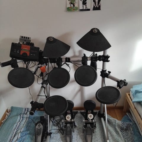 Hyväkuntoiset sähkörummut laadukkalla kick padilla ja pedaalilla.