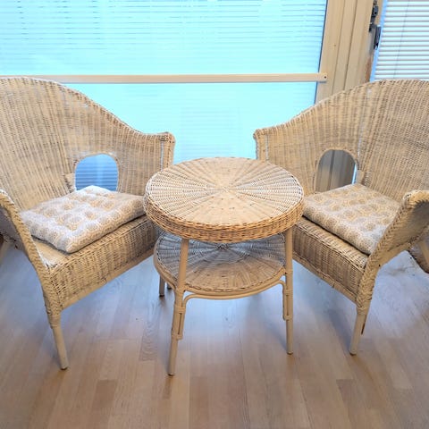 Puiset puutarha- tai parvekepöytä, tukeva metallijalusta, mukana neljä ensiluokkaista rottinkituolia (pöytä ja tuolit lähes uutta vastaavat).