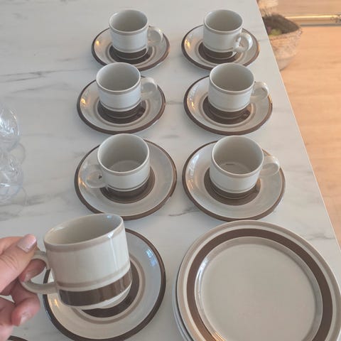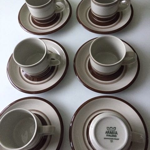 Erittäin hyvässä kunnossa oleva Arabia Pirtti astiasto. Kokonaisuuteen kuuluu 12x pieni kahvikuppi ja lautanen, 4 x isompi kahvikuppi ja lautanen, 13 x jälkiruokalautanen 1 x iso lautanen sekä kermakko ja sokerikko kannella.