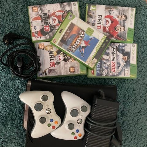 Microsoft Xbox 360 pelikonsoli musta. Mukana kaksi langatonta ohjainta samassa värissä. Kuvat näyttävät, että kokonaisuuteen sisältyy useita Xbox 360 -pelejä eri genreistä, kuten urheilu-, toiminta- ja räiskintäpelejä. Konsoli soveltuu television tai näytön kanssa käytettäväksi kotiviihde- ja pelikäyttöön. Tarkemmat tiedot mukana tulevista peleistä, tallennustilasta ja kaapeleista voi varmistaa myyjältä.