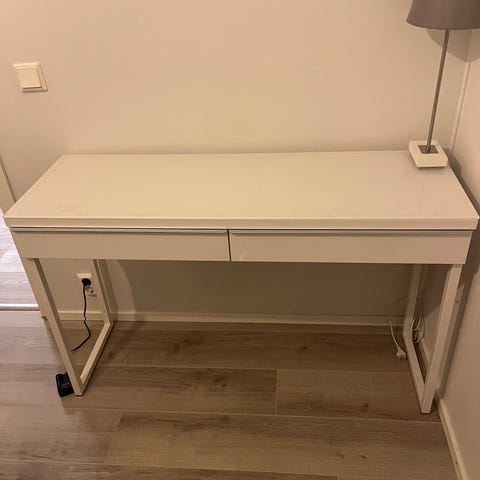Hyvässä kunnossa oleva ja toimiva työpöytä, etuosassa muutossa tulleita jälkiä, saanee maalilla tms peitettyä helposti. Tätä mallia ei enää Ikean valikoimista löytynyt.