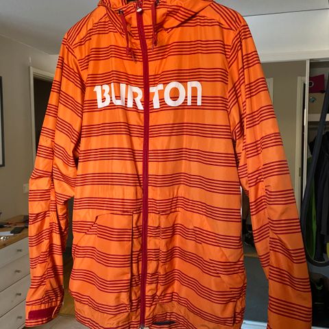 Burton takki miehille, koko L. Väri oranssi. Takissa on huppu ja etutaskut. Materiaalissa on Dryride-merkintä, joka viittaa veden- ja tuulenpitävyyteen sekä hengittävyyteen. Sopii lasketteluun, lumilautailuun ja ulkoiluun.